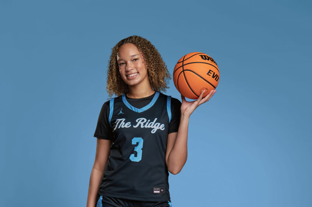 A long, black compression sleeve covers her left leg. She’s wearing her black Riverdale Ridge jersey with baby blue piping running down her shorts and around the neck and arms. Her No. 3 is prominent on her torso just beneath ‘The Ridge’ written in white script across her chest.