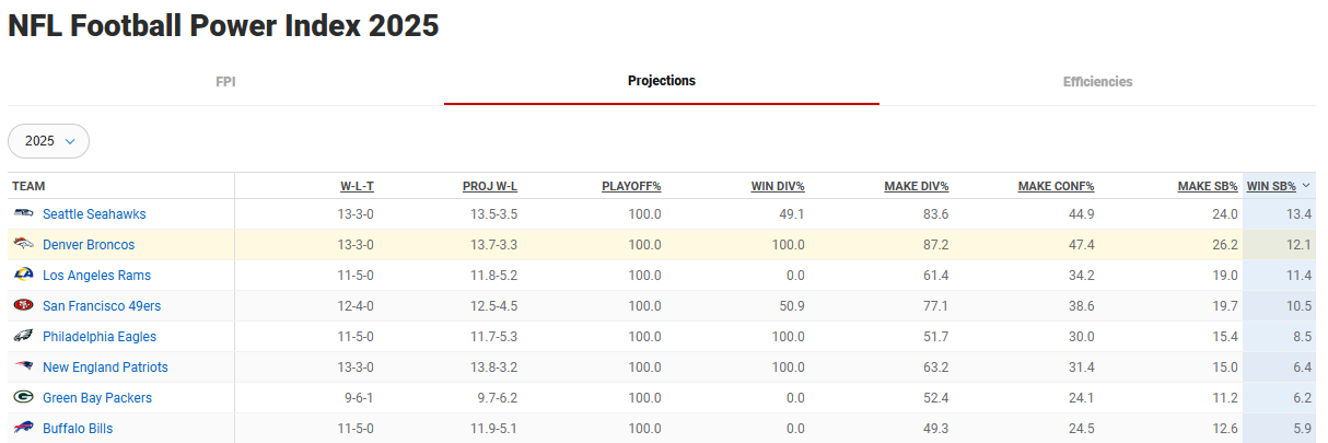 ESPN FPI Index showing the top 8 teams in terms of chances to win the Super Bowl. 1. Seattle Seahawks 2. Denver Broncos 3. LA Rams 4. San Francisco 49ers 5. Philadelphia Eagles 6. New England Patriots 7. Green Bay Packers 8. Buffalo Bills