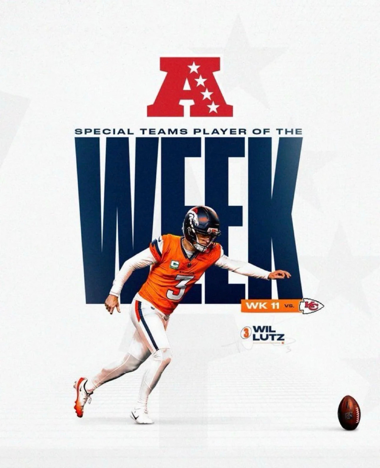 A promotional poster that has the AFC logo and "AFC Player of the Week" written on it. Wil Lutz is in the foreground, about to kick a football.