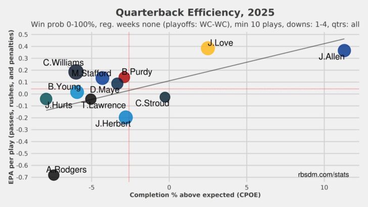 One of those other metrics was quarterback efficiency, or EPA+CPOE, where Allen led all active quarterbacks by a wide margin. (Up and right are good, down and left are bad.)