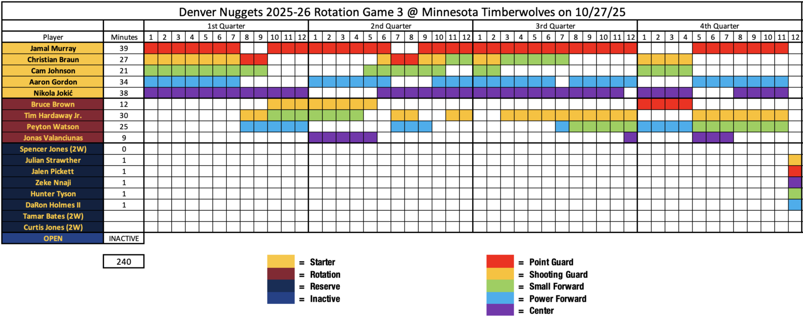 So was Peyton Watson though, not to be forgotten. Watson stepped up and closed in the fourth quarter, playing great perimeter defense and hitting back-to-back threes in the left corner. Watson’s versatility was big defensively, switching from perimeter assignments to guarding Jaden McDaniels and Naz Reid, both of whom were hurting the Nuggets with their scoring throughout.