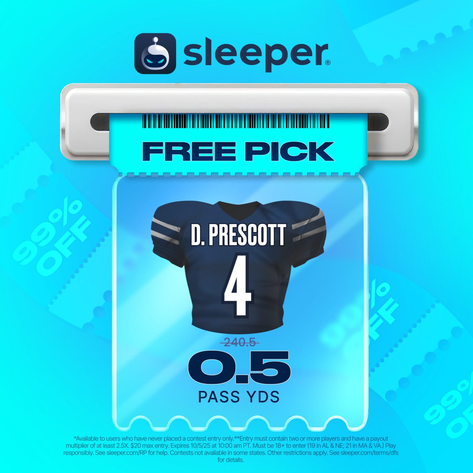 Prescott’s facing one of the toughest secondaries in football, but luckily, Sleeper’s giving you an unbeatable angle. You only need him to complete one pass, a checkdown, a screen, or even a tipped ball to win this pick instantly.