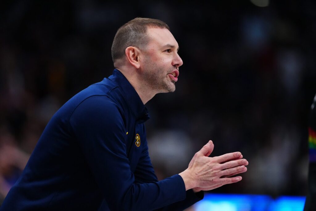 Apr 4, 2026; Denver, Colorado, USA; Denver Nuggets head coach David Adelman during second half of the game against the San Antonio Spurs at Ball Arena. Mandatory Credit: Ron Chenoy-Imagn Images