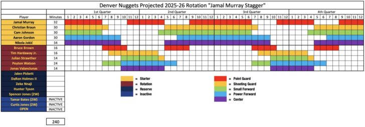 It’s no easy task to build an early season rotation like this. There will be injuries, surprisingly poor fits between different players’ skill sets, and other matchup related factors that go into individual games. Overall though, I think this makes sense. The starters minutes are relatively easy, especially with the malleability of Christian Braun, Cam Johnson, and Aaron Gordon around different skill sets.